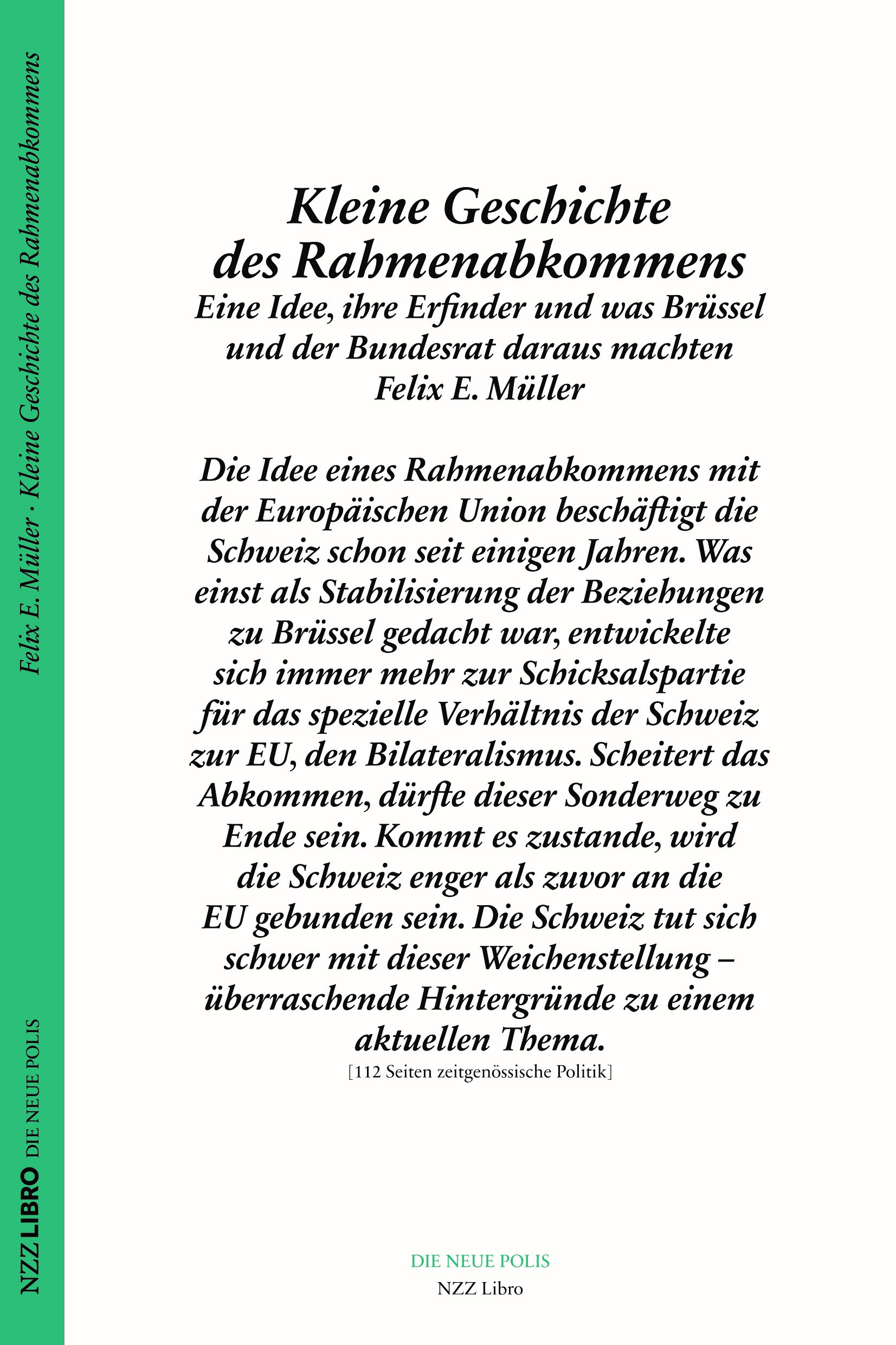 Der langjährige Chefredaktor der NZZ am Sonntag greift das wohl aktuellste politische Thema der Schweiz auf: das Ringen um einen institutionellen Rahmen für die Beziehungen zu Brüssel. Er zeigt auf, wie und wo die Idee entstanden ist und wie sie sich im Verlauf der Zeit verändert hat. Das Buch gibt einen Einblick in die Verhandlungstaktik der Schweiz, in die Rivalitäten im Bundesrat und die Uneinigkeit der Parteien. Eines wird darin klar: Die Idee eines Rahmenabkommens geht viel weiter zurück, als allgemein angenommen und hat sich anders entwickelt, als ursprünglich geplant. Sie legt dabei auch die Schwächen der Schweizer Europapolitik offen.